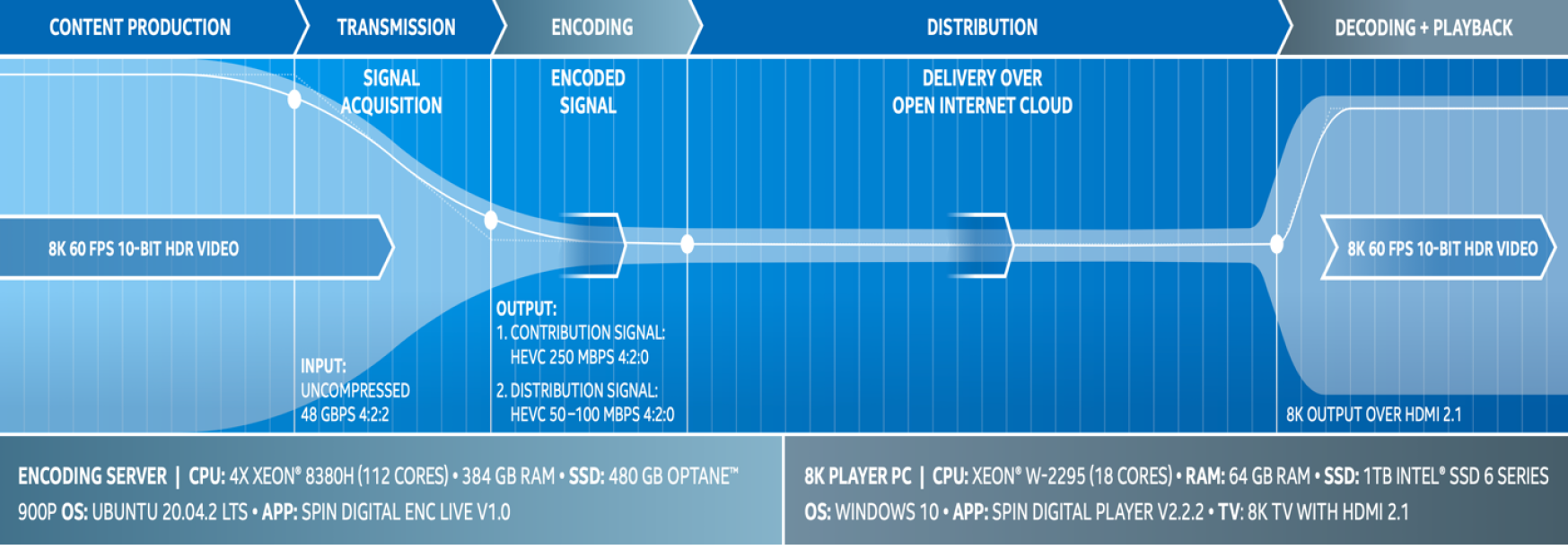 Delivery to the open Internet cloud and from there either HLS or the RTP. We solve the bottlenecks of the 8K TV playback using single cable HDMI 2.1. The only non-Intel part we use is Nvidia graphics card, which handles color correction and outputting this to the HDMI 2.1 compliant TV. All the rest is done by CPU, both from the encoding side and the decoding side.