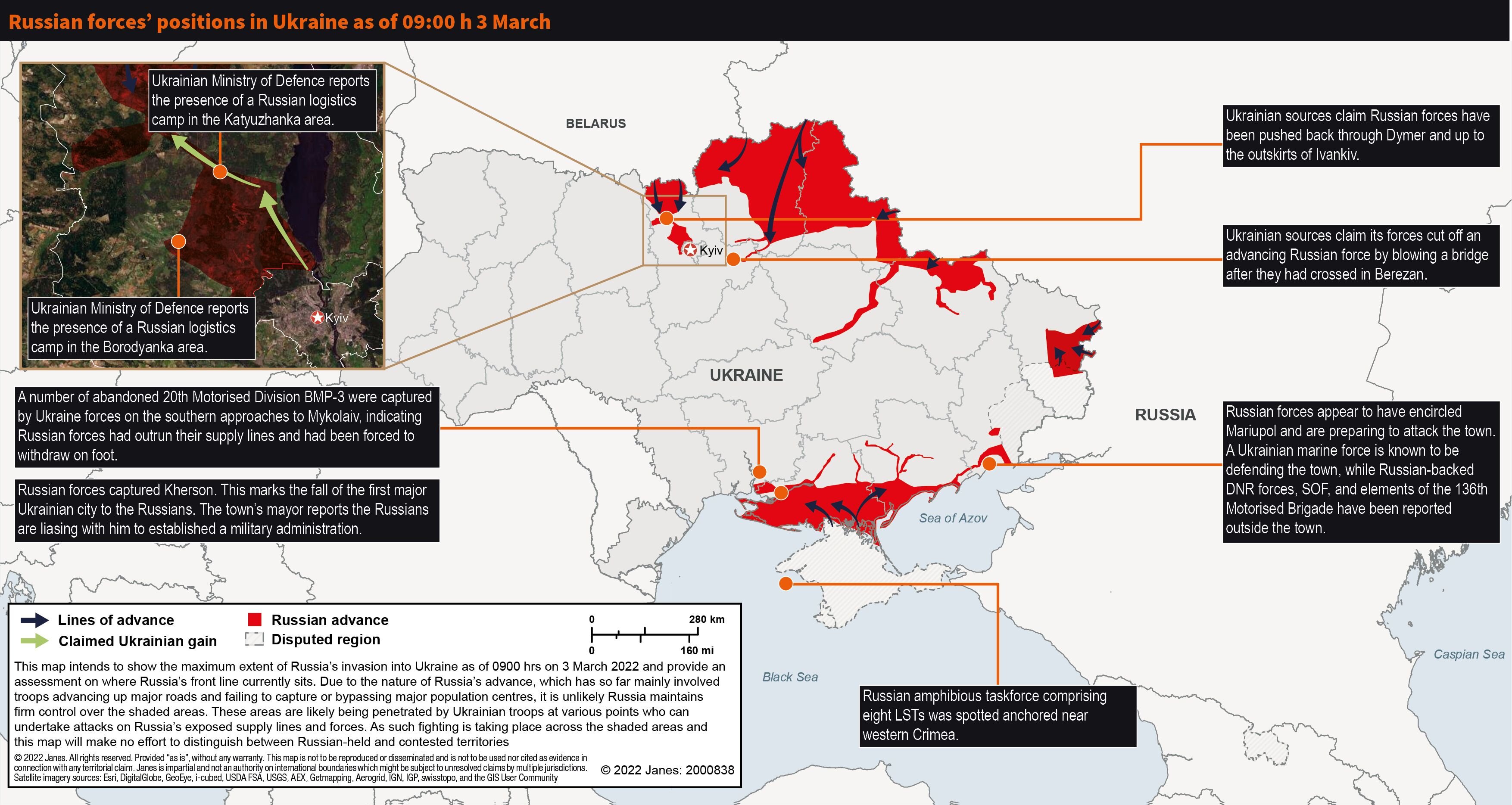 Russian forces’ positions in Ukraine as of 09:00 h on 3 March 2022. (Janes)